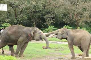 Ellen really wanted to see the elephants. Here are two, unfortunately shackled, but having fun regardless. Amazing how all of us animals crave to be touched, loved.